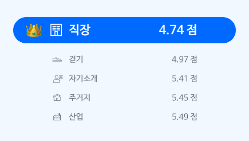 - 직장과 걷기가 4점대의 평균 점수로 최하위를 차지하였고, 이후 자기소개 5.41점, 주거지 5.45점, 산업 5.49점이 뒤를 따르고 있습니다. 이 토픽들은 실생활에서 자주 쓰지 않는 단어들을 사용해야하기 때문에 돌발 토픽으로 나올 경우를 대비해두어야 해요.