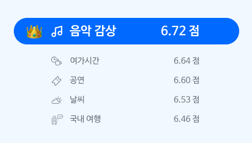 - 상위 점수 토픽들은 평균 6점대의 점수를 가지고 있어요. 그 중 음악감상과 여가시간, 공연이 6.6점 이상의 평균을 가지고 있으며, 날씨 6.53점, 국내여행 6.46점이 뒤를 따르고 있습니다. 이 토픽들은 이야기 거리가 많고, 비교적 쉬운 단어들을 사용하여 답변할 수 있어요.